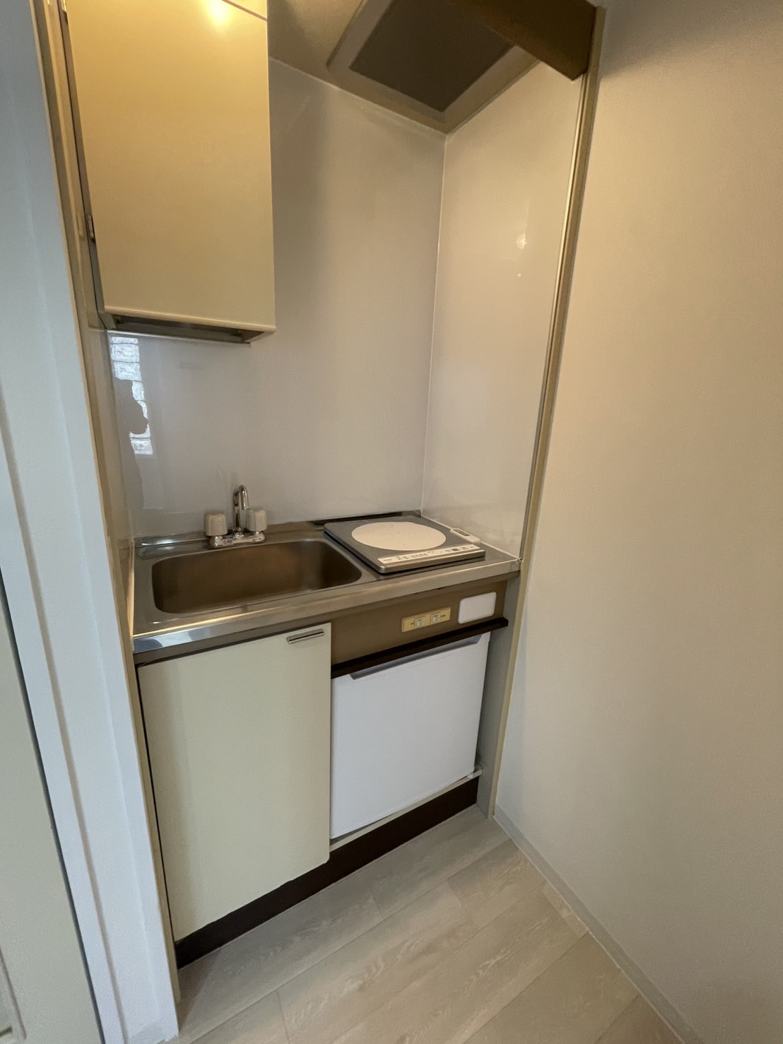 エアコン、システムキッチン(一口コンロ)、シューズボックス、クローゼットなど、コンパクトながら必要十分な生活設備が整っています。 -