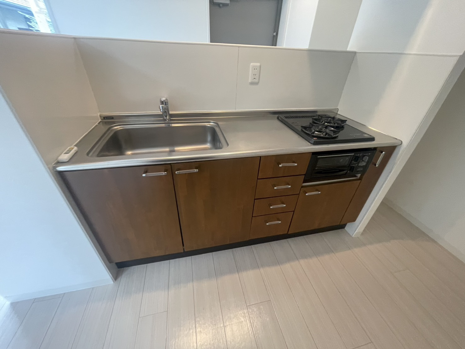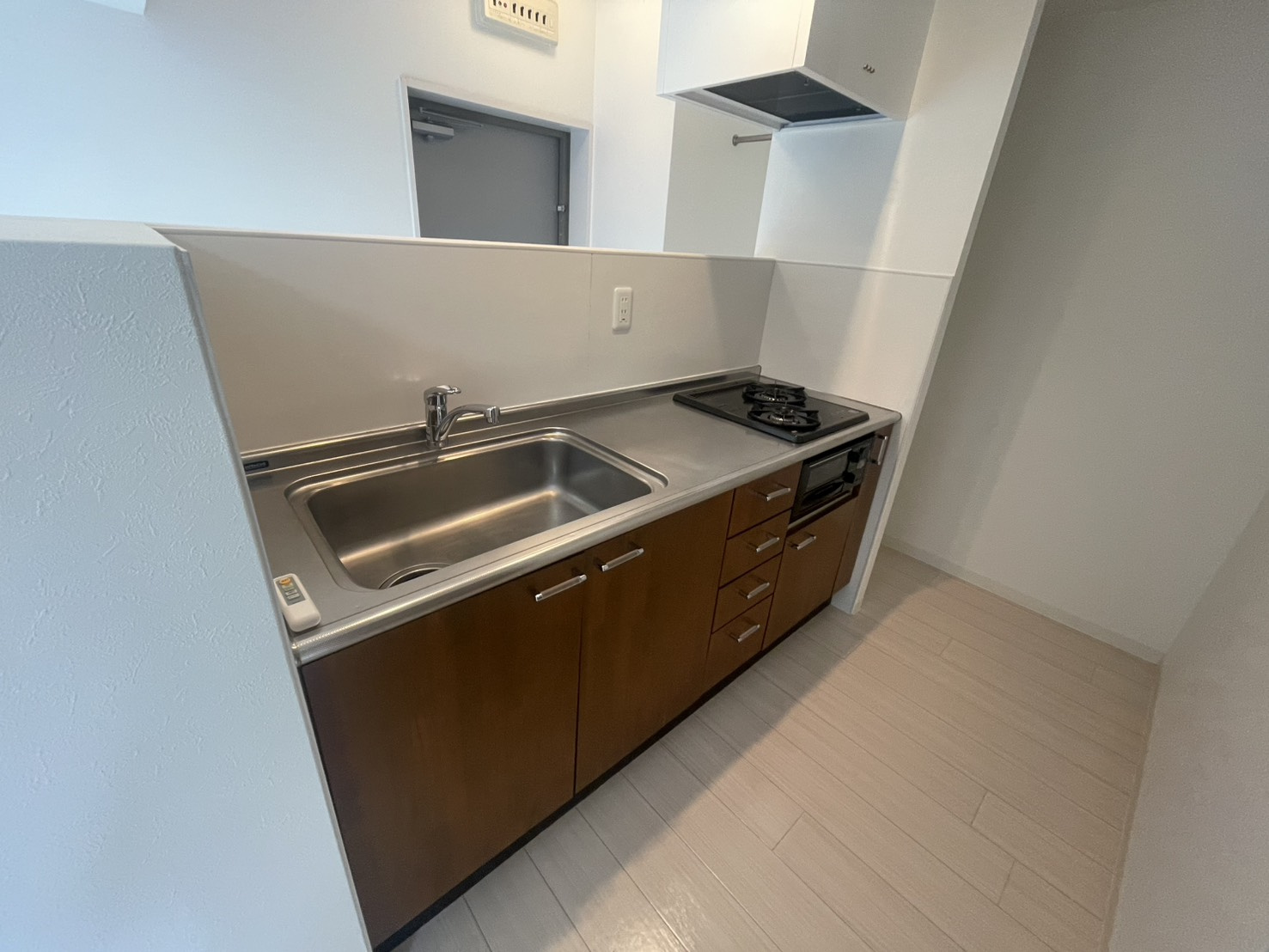白を基調としたフローリングに、2口ガスコンロ付きのシステムキッチン。